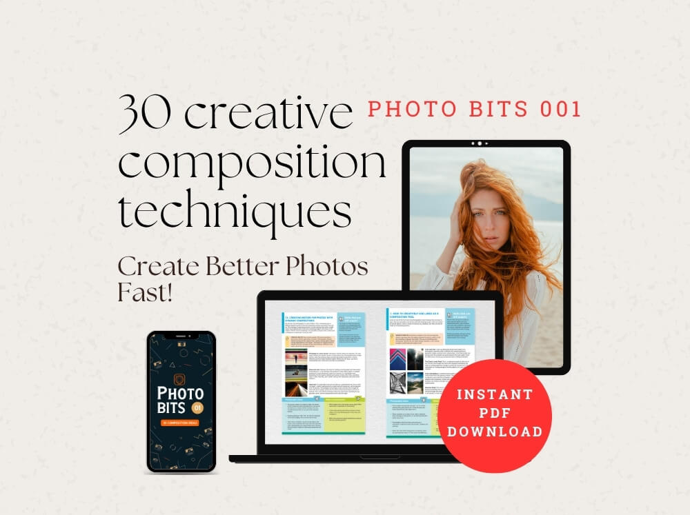Photo Bits 001 is a set of 30 digital creative composition cards in PDF format, available for instant download the moment you purchase. Each card teaches you a specific composition technique with real photo examples, a pro tip, shooting missions and a self-evaluation system. I hate theory overload as much as you do. so this is NOT another 200-page manual / book you will never finish.